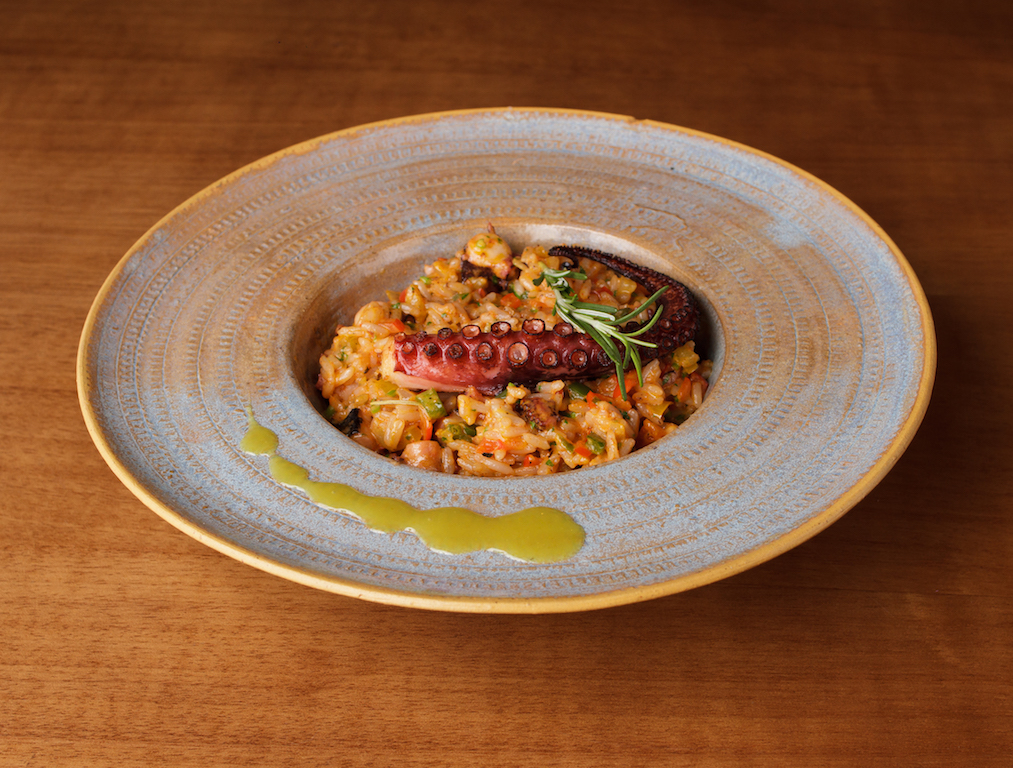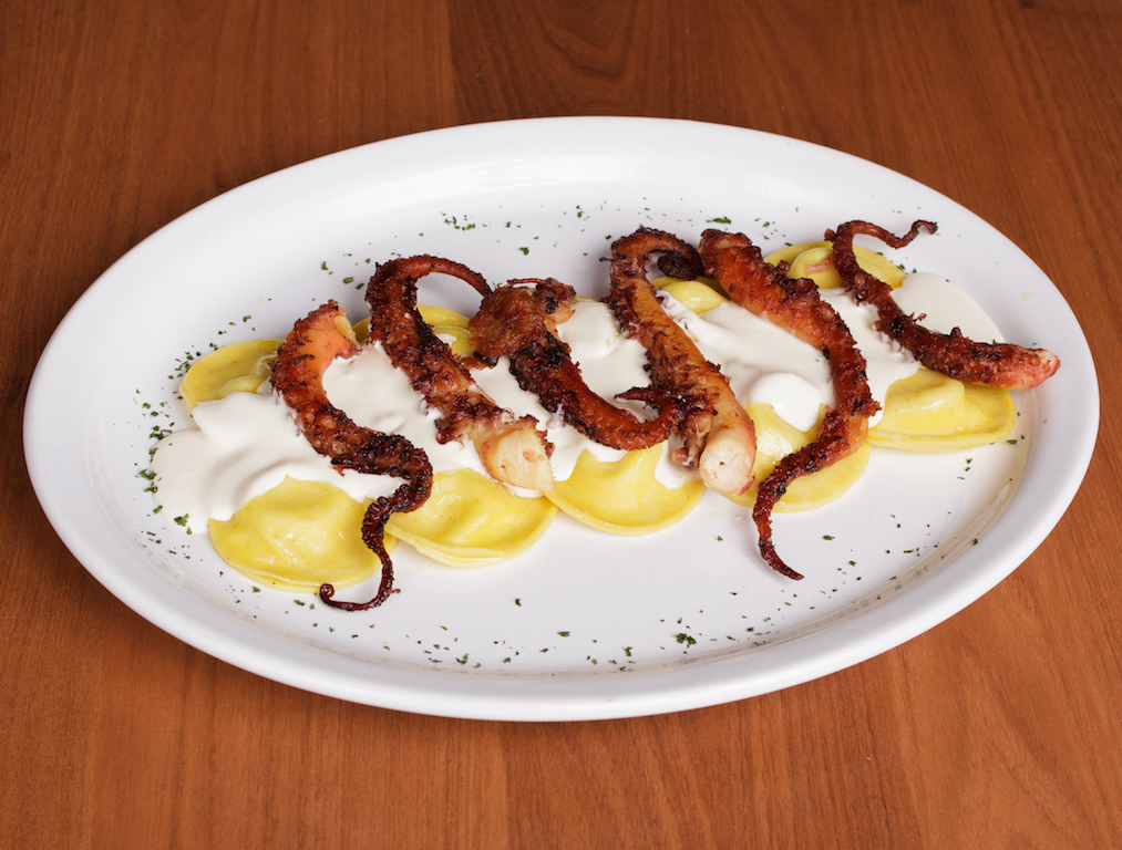 Polvo grelhado sobre raviólis de burrata e molho negro. Av. Dr. Antônio Gomes de Barros, 150 – Jatiúca/ (82) 3202-8828