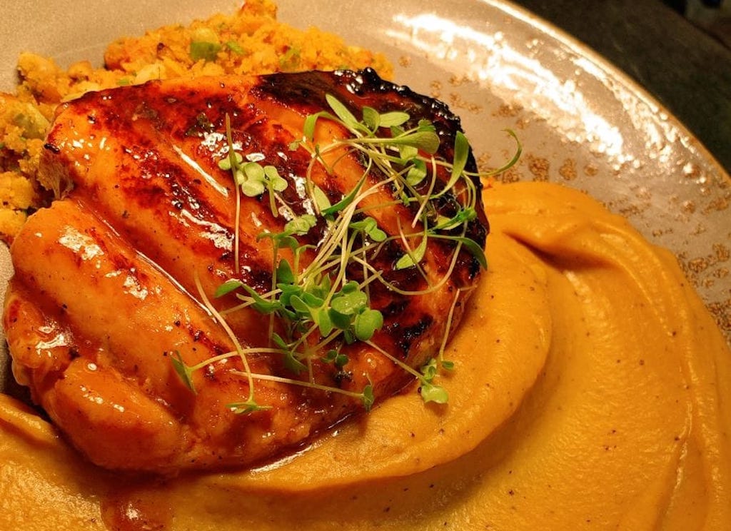 Filé de Camarão com redução de laranja, acompanha purê de batata doce e disco de parmesão./ Av. Silvio Carlos Viana, 27 – Ponta Verde,/ (82) 3231-7484