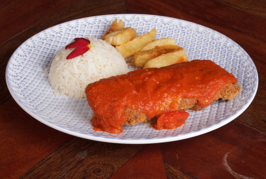 Parmegiana de carne de sol com arroz e macaxeira frita/ Av. da Paz, 1140 – Jaraguá/ (82) 3223-8080