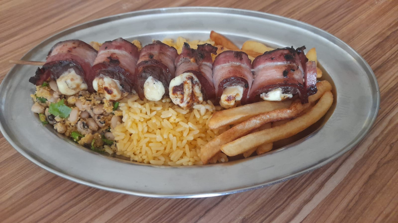 Queijo coalho envolvido com lâminas de carne de sol e bacon, servido com feijão tropeiro, arroz e batata frita ou macaxeira ou cuscuz/ Rodovia AL 220 Km 6 – Jardim Esperança, Arapiraca-AL/ (82) 3522-1881