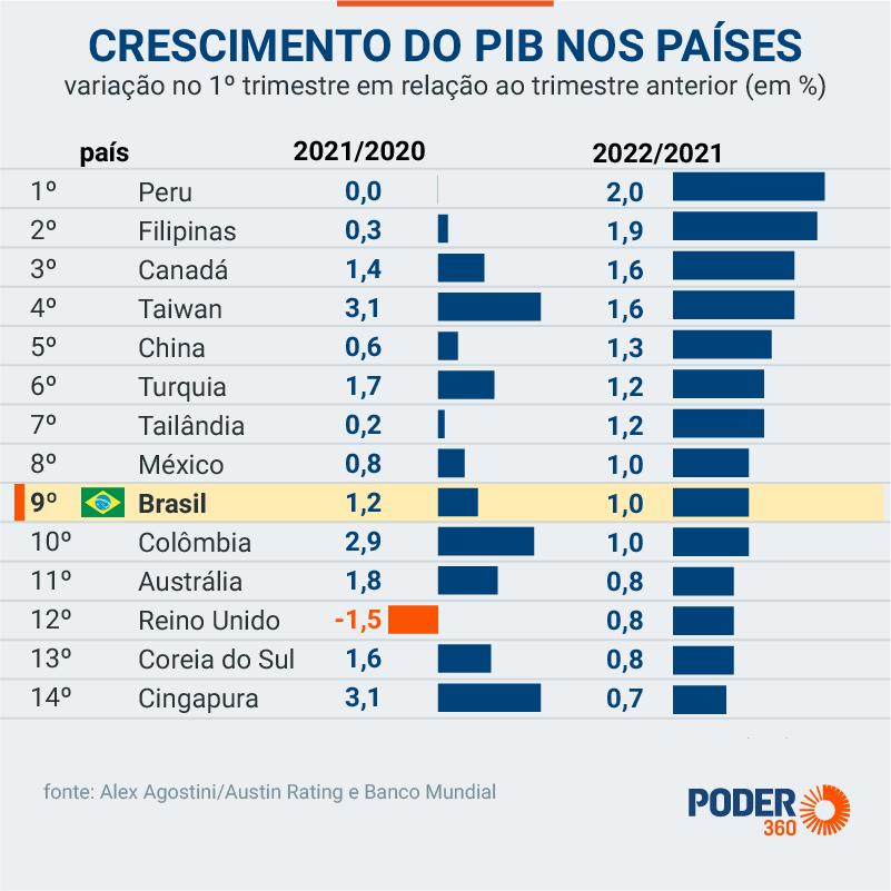 O Brasil ficou em 9º entre 32 países no ranking de melhor alta do PIB no 1º trimestre de 2022 contra o último de 2021, atrás de Peru, China, Turquia e México. A economia do país cresceu mais que as de Colômbia, Alemanha, França, Itália e Estados Unidos.