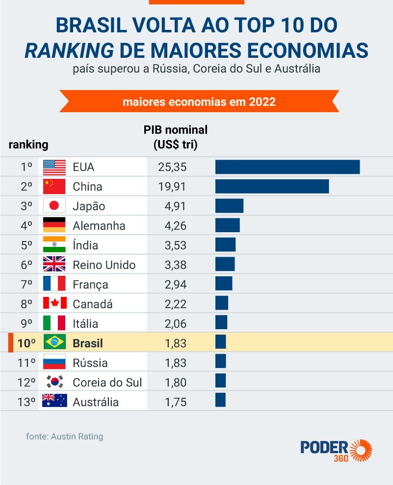 O Brasil voltou a integrar o top 10 das maiores economias do mundo, posto que não ocupava desde 2020. Segundo ranking da Austin Rating, o país saiu da 13ª posição no 4º trimestre de 2021 para a 10ª em março de 2022. Eis a íntegra do levantamento (81 KB). O PIB (Produto Interno Bruto) nominal do Brasil chegou a US$ 1,83 trilhão no 1º trimestre deste ano. O país superou Rússia (US$ 1,83 trilhão), Coreia do Sul (US$ 1,80 trilhão) e Austrália (US$ 1,75 trilhão).