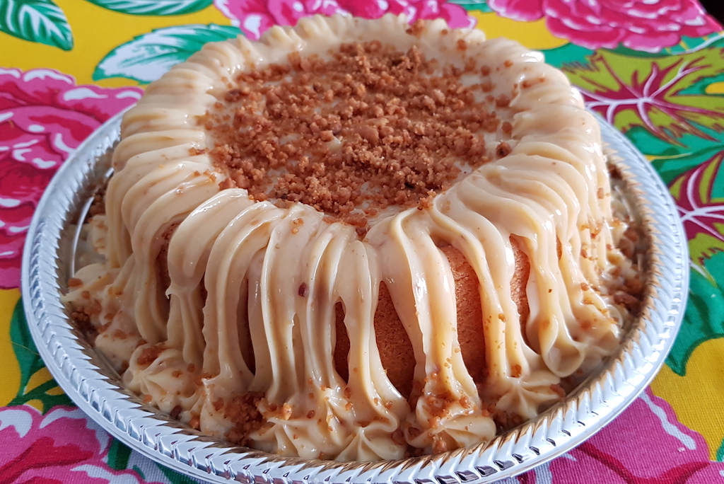Bolo de baunilha com cobertura de brigadeiro de paçoca