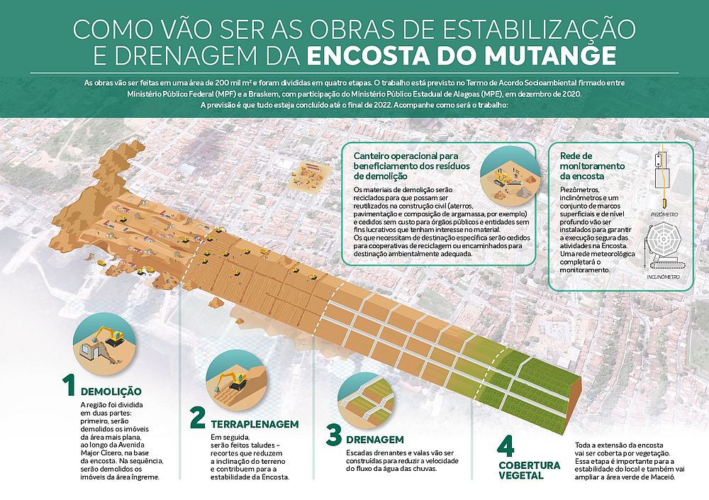 A Braskem iniciará o projeto de estabilização e drenagem da Encosta do Mutange nesta quinta-feira, dia 6 de janeiro. A obra está prevista no Termo de Acordo Socioambiental firmado entre o Ministério Público Federal e a Braskem, com participação do Ministério Público Estadual, em dezembro de 2020. Como se trata de uma encosta, o local é naturalmente instável e, ao longo dos anos, foi ocupado de forma irregular e desordenada.