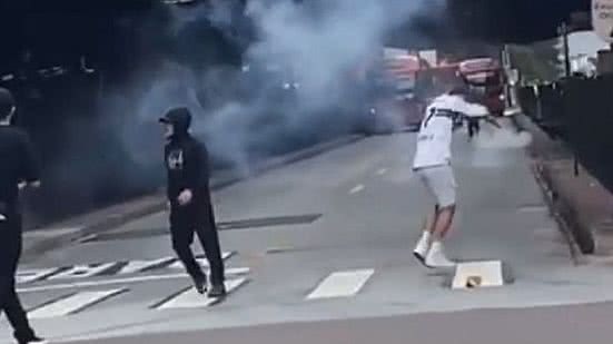 Um desses homens lança fogos dentro do terminal, na direção de um transporte. Alguns passageiros saem correndo desesperados na tentativa de fugir do conflito.