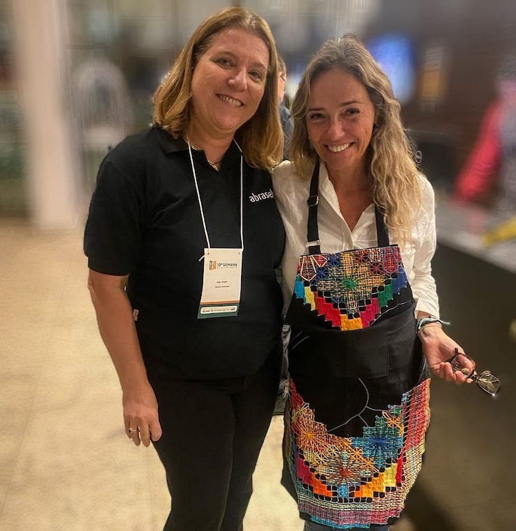 Vega Vergetti da Abrasel com a chef confeiteira Carole com avental de filé