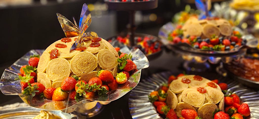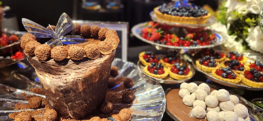 O menu é uma experiência com as principais comidinhas do buffet, como salmão com bacon com couli de amoras, camarão crespo, camarão na tapioca, camarão com provolone e tapioca, risotinho de filé com funghi, phylo de damasco, crocante de brie com limão siciliano, bacalhau confitado, gratin de camarão, raviole de queijo especiais com tomatinhos confitados no azeite de ervas, mini beef Welington e brigadeiro belga.