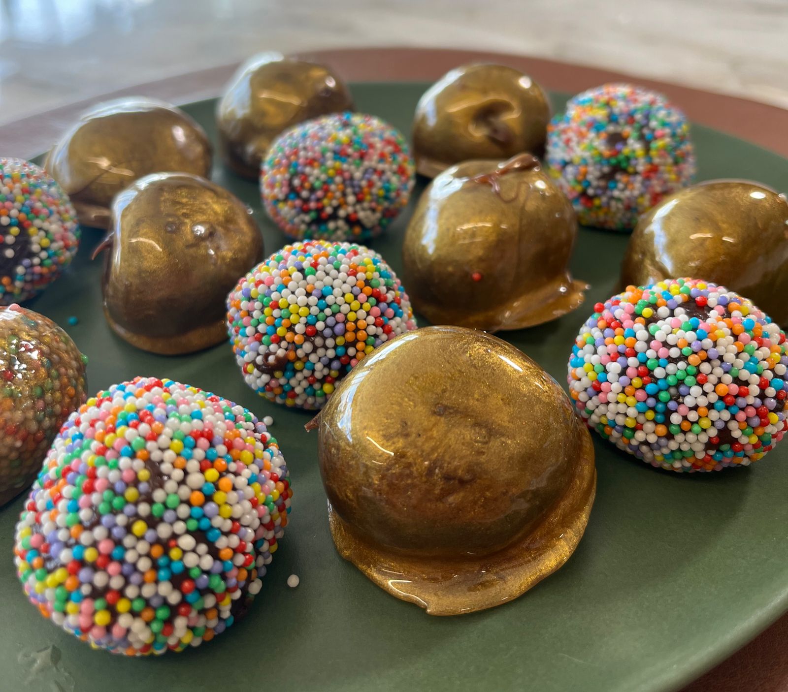 Em seguida, enrole os brigadeiros e coloque sobre uma bandeja untada. Espete uns palitos de dente em cada brigadeiro e reserve. Agora vamos preparar a calda para a cobertura crocante: