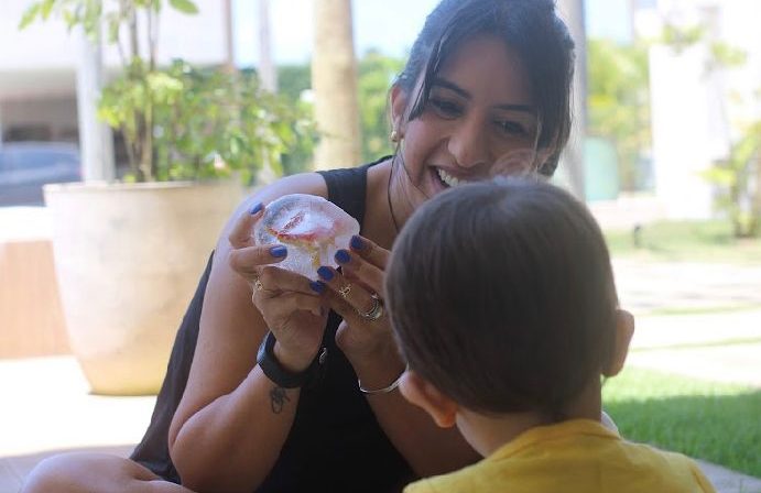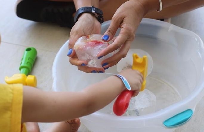 Agora, com a ajuda de um martelinho de brinquedo, deixe os pequenos baterem a vontade, passar pano, ou até chupar heheh, tudo para derreter o gelo “fóssil” e achar a espécie de dinossauro que estava congelada.