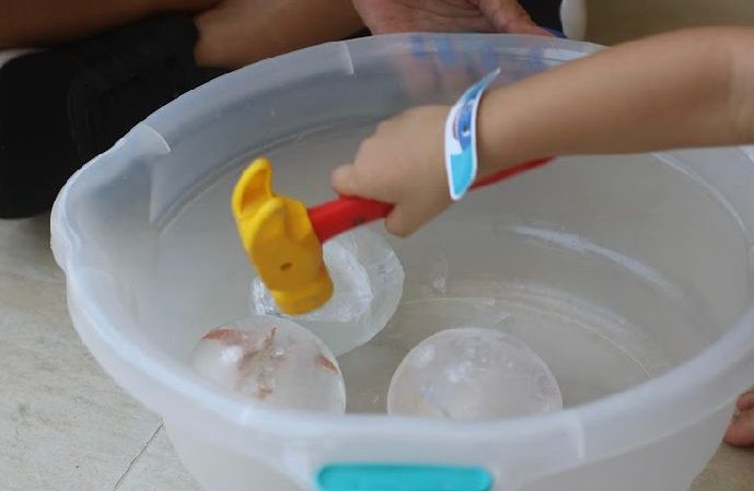 Agora, com a ajuda de um martelinho de brinquedo, deixe os pequenos baterem a vontade, passar pano, ou até chupar heheh, tudo para derreter o gelo “fóssil” e achar a espécie de dinossauro que estava congelada.