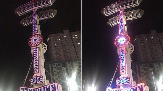 O brinquedo chamado 'Kamikaze' faz giros de até 360 graus, sem longas paradas durante o percurso. Na noite desta segunda-feira, pessoas que estavam do lado de fora do brinquedo notaram que havia algo de errado. O equipamento parou no ar, deixando todas as pessoas de cabeça para baixo por quase dez minutos.