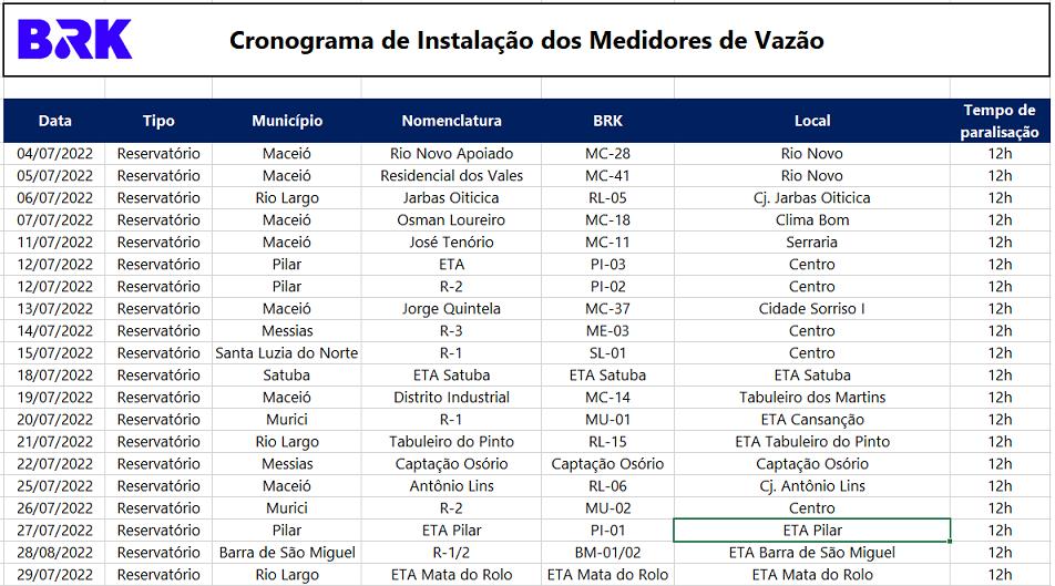 A BRK realizará a instalação de macromedidores de vazão em 20 pontos de reservação de água na Região Metropolitana de Maceió ao longo do mês de julho. A ação faz parte dos esforços da empresa para reduzir as perdas de água, uma das metas contratuais do projeto de concessão, já que os equipamentos medem a quantidade de água recebida nos reservatórios e o volume distribuído nas localidades atendidas.