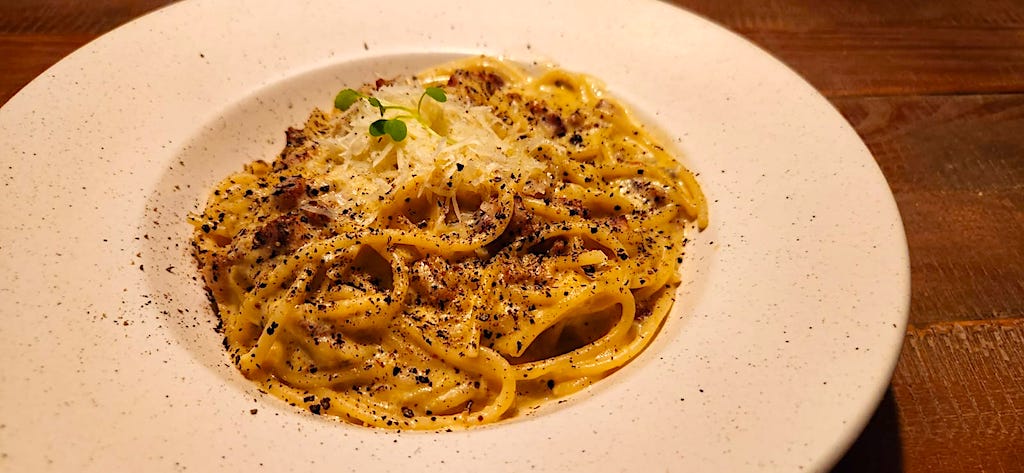 Espetáculo: carbonara do chef Thiago Brandão, receita clássica italiana,
