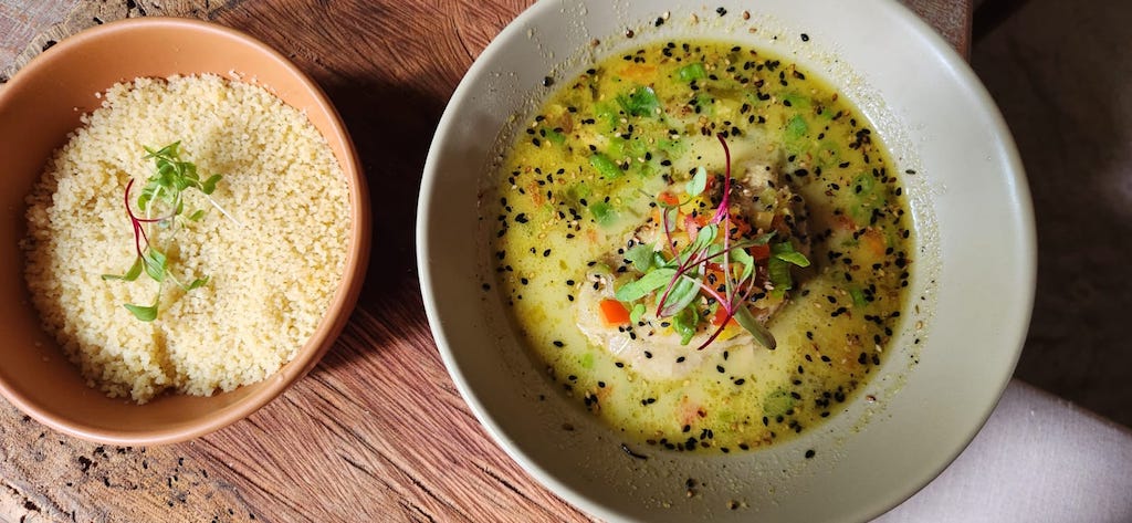 Novas experiências incluem o frango ao molho verde, que me surpreendeu muito, a sobrecoxa no molho leite de coco e ervas frescas, dando um tom elegante ao paladar, e, para não desperdiçar o molho, o cuscuz de sêmola para a gente misturar, sem perder a leveza. A cara da chef Denise Xavier…