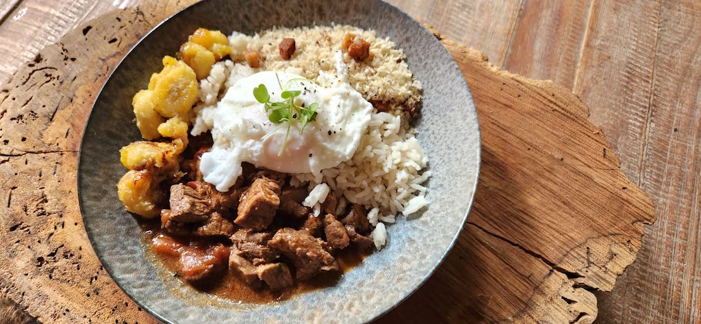 No time do almoço tem o picadinho filé mignon em cubinhos, escoltado com farofa de crocante, arroz, ovo pochê e a tal banana caramelada, proporcionando um leve agridoce ao paladar.