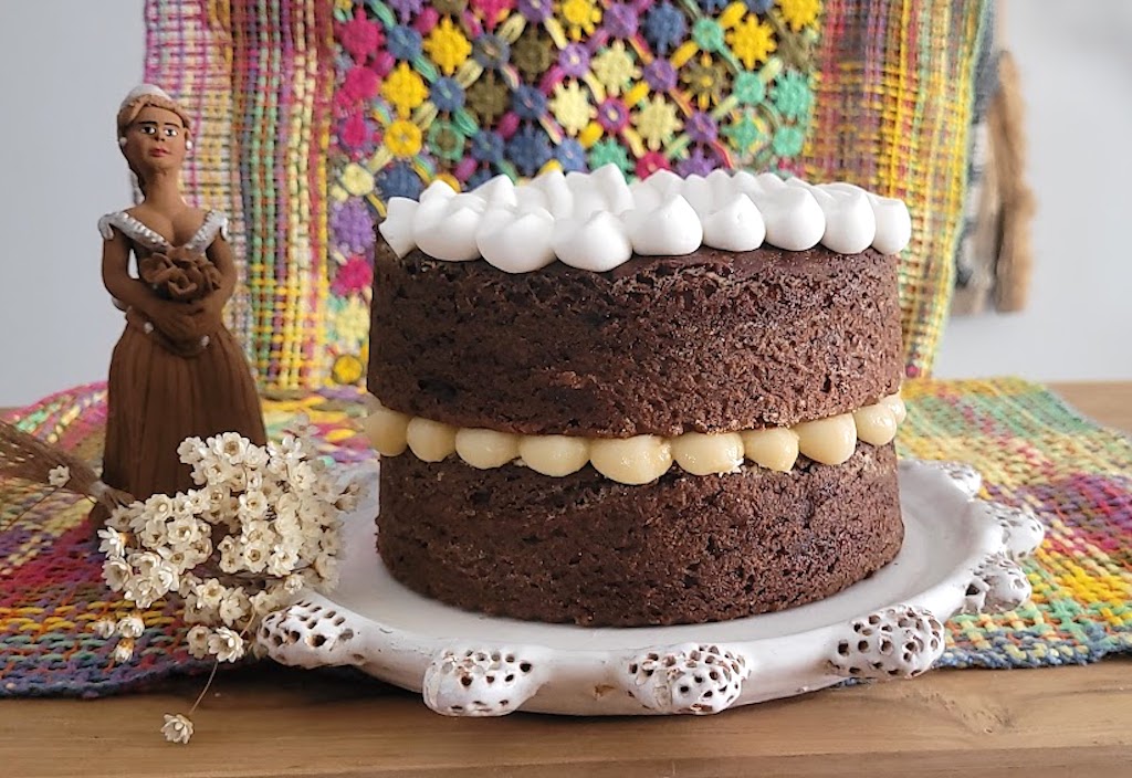 O bolo de noiva da confeiteira Dani Franco (@confeitariadanifranco), segue a receita pernambucana, que tem como base o bolo inglês. Mas coube a família Asfora, lá de Recife, em 1950, que adicionar vinho do Porto, ameixas e frutas cristalizadas à massa. na cobertura, o glacê mármore, feito à base de claras de ovos, açúcar e suco de limão.