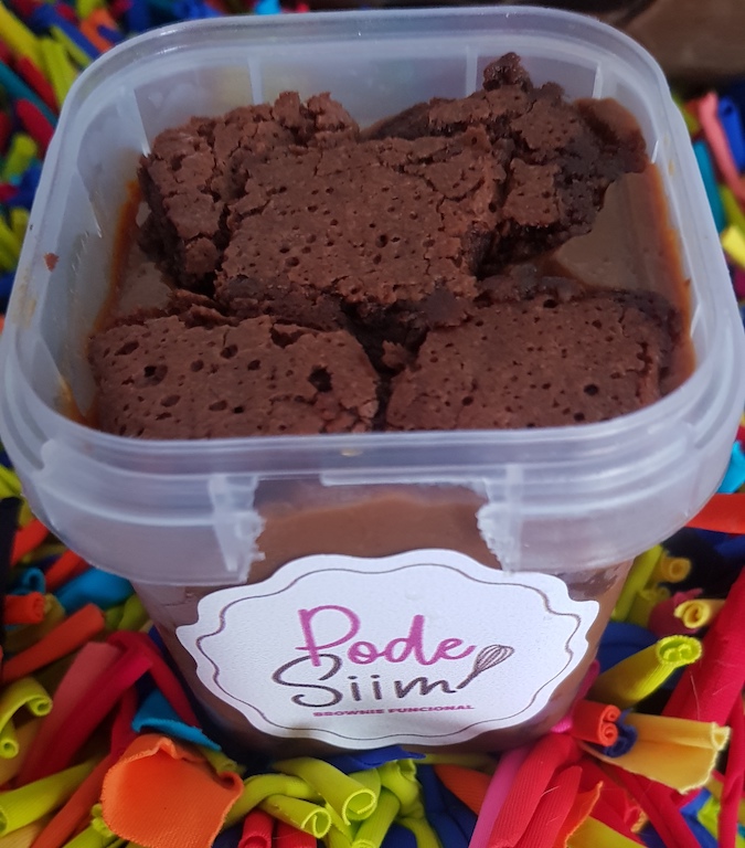 Gente do céu, brownie funcional existe e é muito bom! Batizado de “Pode Siim!”, o docinho de chocolate tem casquinha tradicional e é super macio. A receita leva chocolate com 50% cacau, açúcar demerara, ovos caipira, óleo de girassol, farinha de castanha de caju, farinha de arroz e amido de milho.