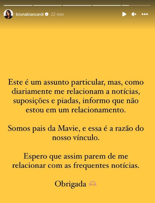 "Este é um assunto particular, mas, como diariamente me relacionam a notícias, suposições e piadas, informo que não estou em um relacionamento. Somos pais da Mavie, e essa é a razão do nosso vínculo. Espero que assim parem de me relacionar com as frequentes notícias. Obrigada", escreveu ela no Instagram. Leia abaixo: