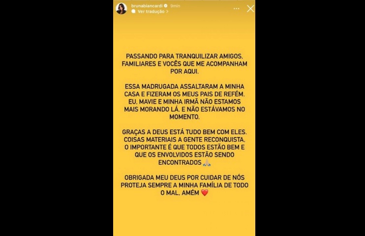 Bruna Biancardi se pronunciou no Instagram sobre o assalto à casa dos seus pais, que foram reféns, em Cotia, São Paulo. A influencer tranquilizou os fãs e disse que não mora mais no local.