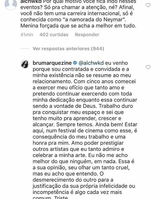 “Eu não me acho melhor do que ninguém em nada. Essa é a sua opinião, seu olhar um tanto quanto cruel, mas eu acho que entendo. O desmerecimento do outro para a justificação da sua própria infelicidade ou incompetência é algo cada vez mais comum. Triste”, finalizou Bruna Marquezine.