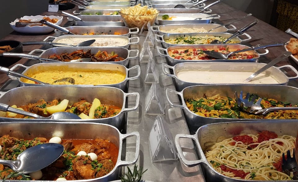 O bufê é bem variado. São 46 pratos quentes, 28 saladas e 19 sobremesas. Confesso, é preciso ter muito foco na hora de escolher o que colocar no prato, porque a gente deseja tudo, das saladas coloridas, os três tipos de arroz, carne, peixe, galinha… Eu, por exemplo, adoro fava. Até aí, tudo bem. O “problema” é que quando olhei para frente apareceu o pernil de carne, galinha guisada, bacalhau, bife ao molho de cerveja… Entende como é difícil escolher com tanta comida atiçando sua gula?