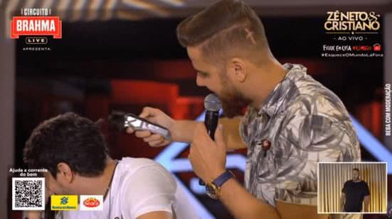 Cristiano terminou a live com novo visual neste domingo (12). Logo no início da live, o cantor prometeu que iria raspar o cabelo caso batessem a marca de 200 toneladas de alimento. E eles conseguiram! Em meados do show, a dupla atingiu o número esperado e o sertanejo pagou o desafio ao vivo. O novo corte foi feito por Zé Neto que, inicialmente, raspou apenas o centro e, depois, completou o look.