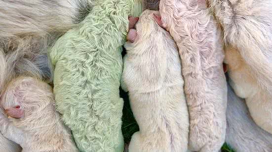 Um fato raro aconteceu no início deste mês na Sardenha, ilha que pertence a Itália. Um cachorro nasceu com o pelo da cor verde, bem diferente dos seus oito irmãos.
