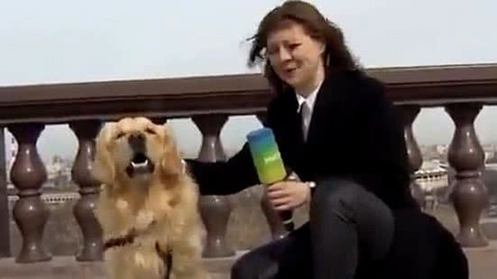 Ela falava da previsão do tempo quando um golden retriever se aproximou, pulou, arrancou o equipamento de sua mão e saiu correndo. A repórter perseguiu o animal pela rua e, no estúdio, a apresentadora do Mir 24 ficou sem reação.