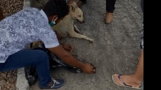 Vídeos que circulam nas redes sociais mostram que a cadela ficou muito ferida e teve as vísceras expostas após a agressão. Algumas pessoas que testemunharam o crime ainda juntaram-se para custear uma cirurgia para a cadela, mas sem sucesso. Veja vídeo: