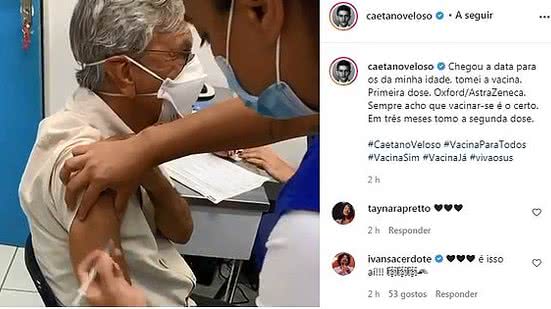 "Chegou a data para os da minha idade, tomei a vacina. Primeira dose. Oxford/AstraZeneca. Sempre acho que vacinar-se é o certo. Em três meses tomo a segunda dose", escreveu o artista em suas redes sociais.