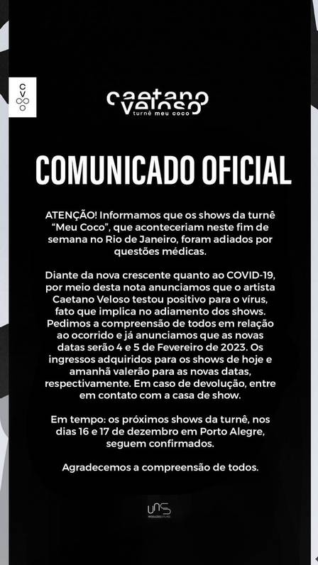 "Informamos que os shows da turnê 'Meu Coco', que aconteceriam neste fim de semana no Rio de Janeiro, foram adiados por questões médicas. Diante da nova crescente quanto ao COVID-19, por meio desta nota anunciamos que o artista Caetano Veloso testou positivo para o vírus, fato que implica no adiamento dos shows", publicaram em nota.