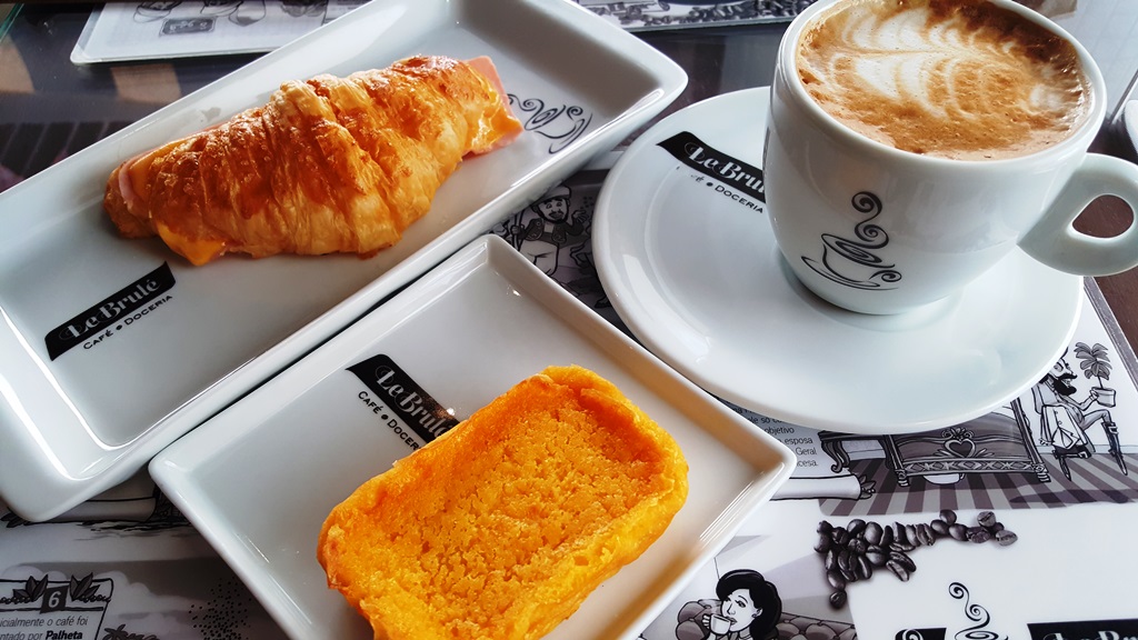 Café – O Lé Brulé oferece mais de uma opção do café da manhã. Pode ser suco, café e croissant de queijo e presunto, ou pãozinho de queijo. Democraticamente, cada um monta seu desjejum.