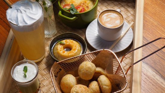 Na bandeja brasileira, vem uma panelinha com mousseline de macaxeira, carne de sol e manteiga de garrafa; o tradicional pão de queijo da nonna, que já virou queridinho dos cafés da manhã; e, claro, um dos doces mais amados do país: o pudim de leite, desta vez com calda de tangerina para um toque ainda mais especial. Para completar, uma verrine divina feita com mel, iogurte e creme de abacate. E, para harmonizar essas delícias, o chá gelado de capim-limão e um macchiato (60 ml).