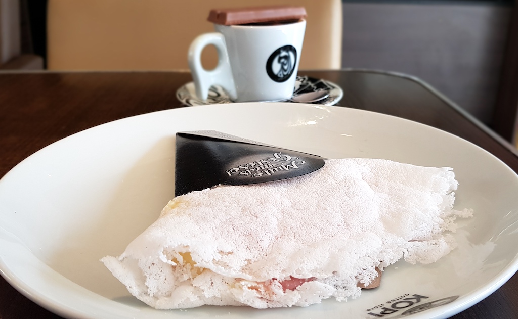 Pois bem, nos dias de domingo desse novo normal, o totem de álcool e a aferição da temperatura dão boas vindas ao café da manhã do Kopi, com cardápio variado, de sandubas e cafés. Com destaque para a tapioca (bem sequinha e crocante), que lembra um crepe fino. Por sinal, adorei a de queijo com presunto.