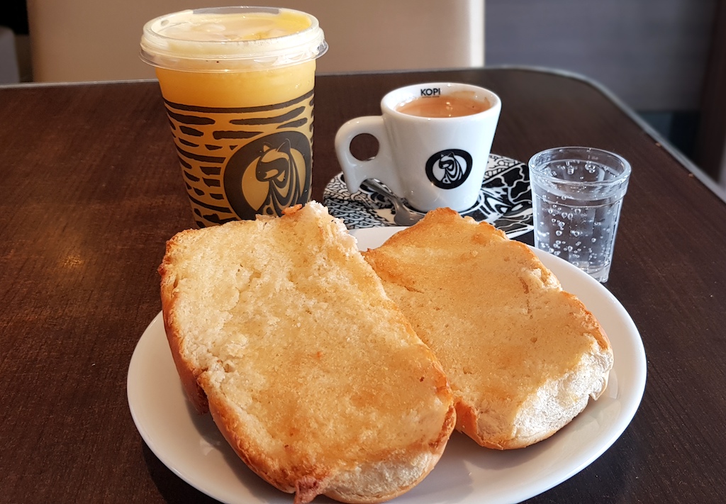 Café da manhã básico: Pão na chapa, café e suco de laranja