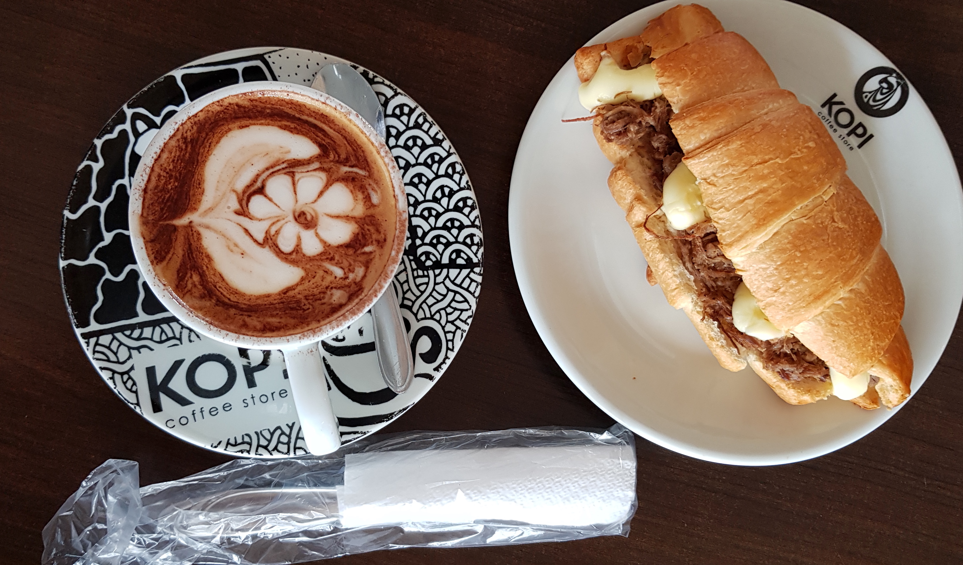 Croissant com carne de sol e requeijão, café com leite e talher em saco plástico