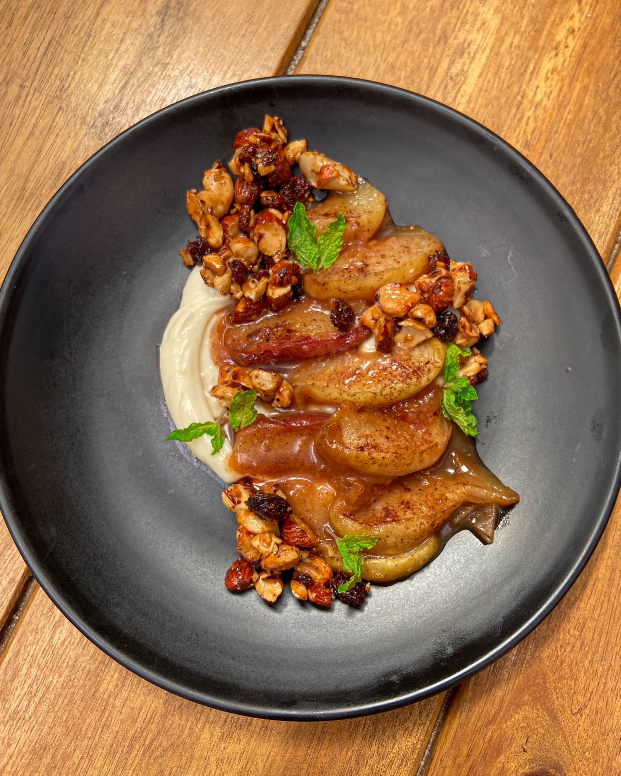 Pêssego caramelizado com mix de castanha.