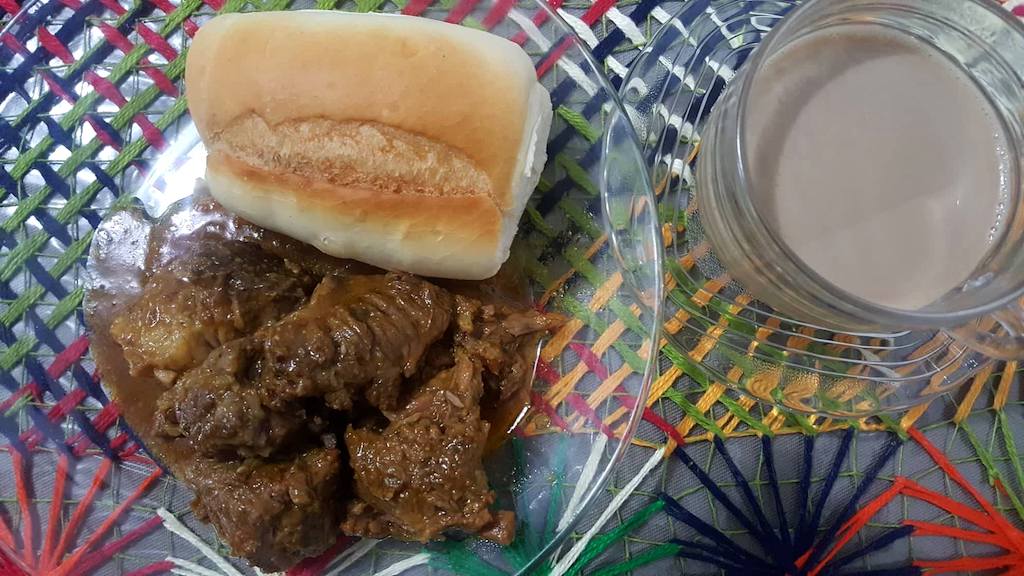 Simplicidade: carne guisada, pão francês e café com leite, bom demais