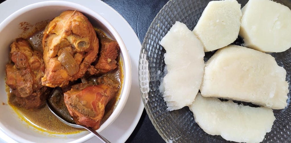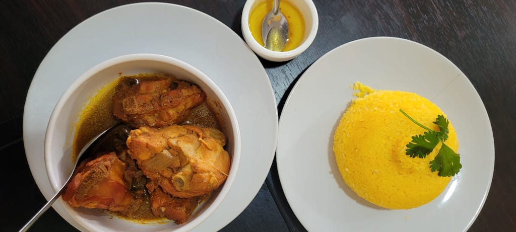 Galinha guisada combina com cuscuz. Preço: R$ 10,00