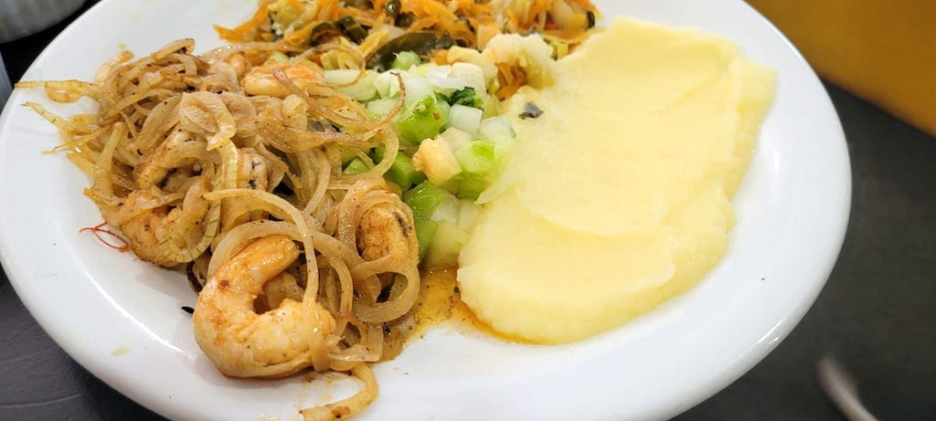 Já no almoço, a gente escolhe uma proteína, pode ser camarão acebolado, carne do sol, fígado, carne, mas o campeão de vendas é o filé de tilápia frita. E para acompanhar o cliente, tem opções de arroz (brócolis, cenoura, branco ou integral), feijão (caseiro ou preto), macarrão, salada, legumes e farofa de banana. Pode ser um item de cada, ou no meu caso, apostei nos legumes e purê batata, mas tem gente que pede tudo que tem direito (risos). É só felicidade.