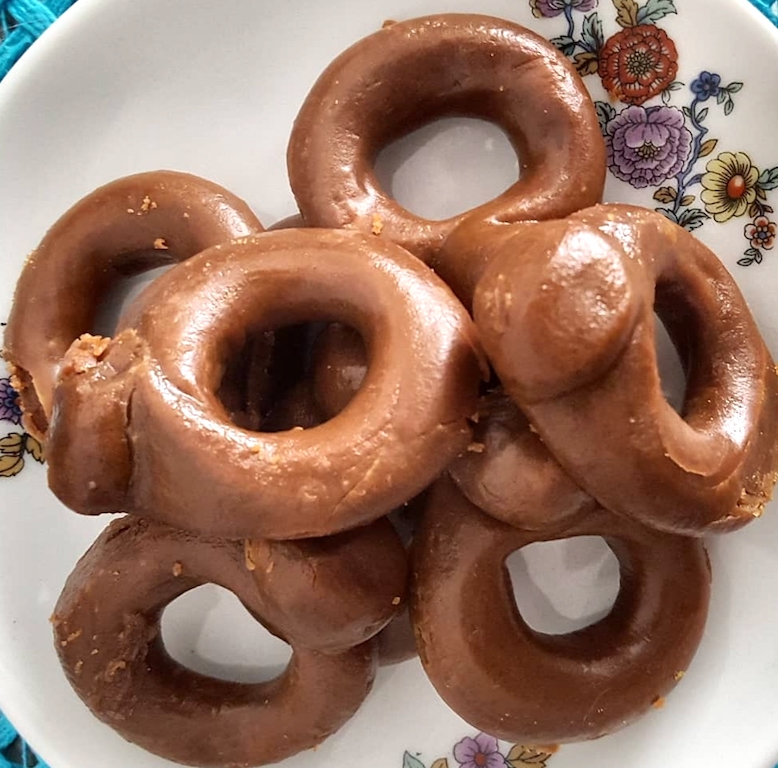 Depois do café com leite e degustação de queijos, sempre vamos às compras. Eu sempre trago para casa o “doce de leite em anel” da cidade de Olho D’Água das Flores, porque na Casa do Queijo têm produtos alagoanos e pernambucanos para nossa felicidade. O formato é de anel, a casquinha é levemente açucarada e o recheio, macio: uma glória. O docinho é preparado com esmero por Joseilma Barbosa Nobre, de Olho D’Água das Flores.