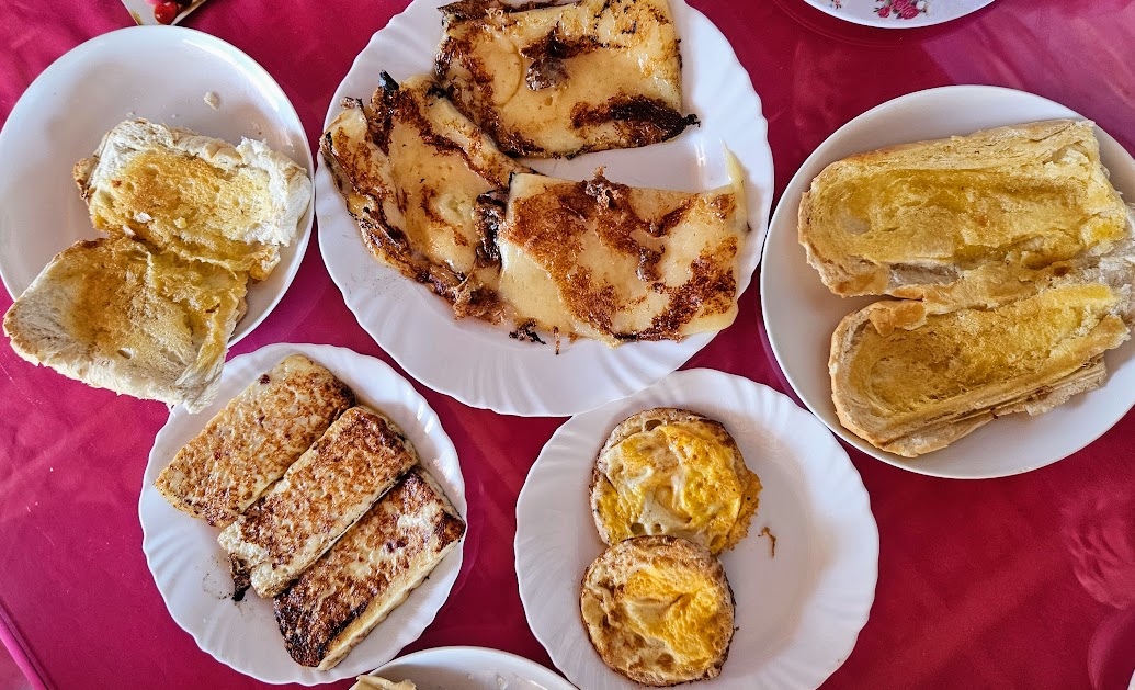 Café da manhã com pão na chapa, ovo queijos manteiga e coalho