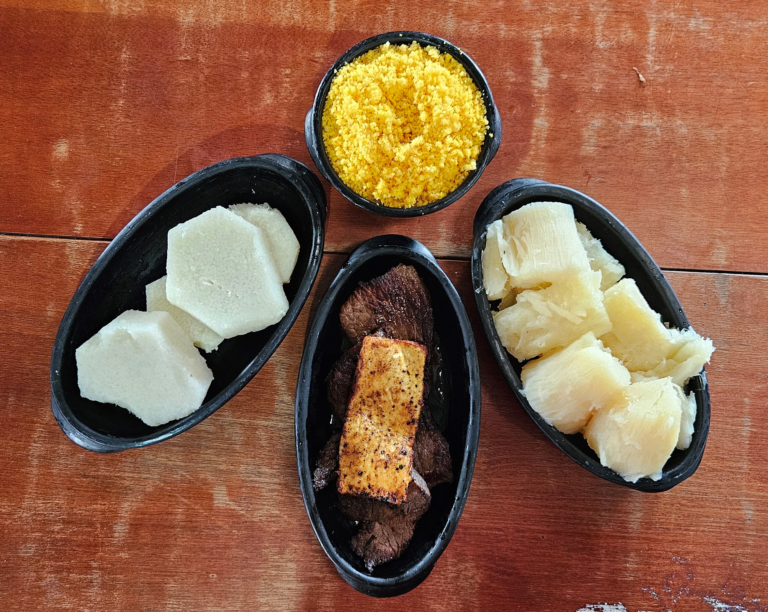 Carne de sol com queijo coalho, macaxeira, inhame, e cuscuz