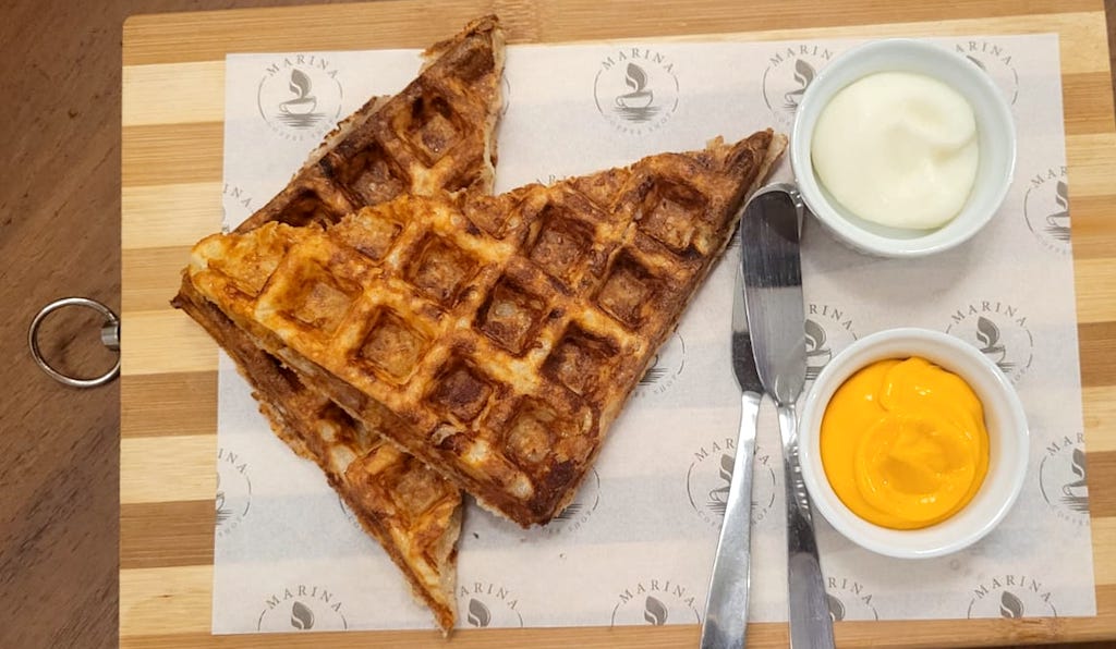 Waffle de pãozinho de queijo uma das estrelas da Marina Coffee