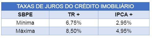 Além das taxas corrigidas pela TR, existe a alternativa de crédito para imóveis residenciais com recursos do SBPE corrigidos pelo Índice Nacional de Preços ao Consumidor Amplo (IPCA). A tabela comparativa a seguir contém as taxas de juros dos financiamentos imobiliários com recursos do SBPE, de acordo com o fator de correção: