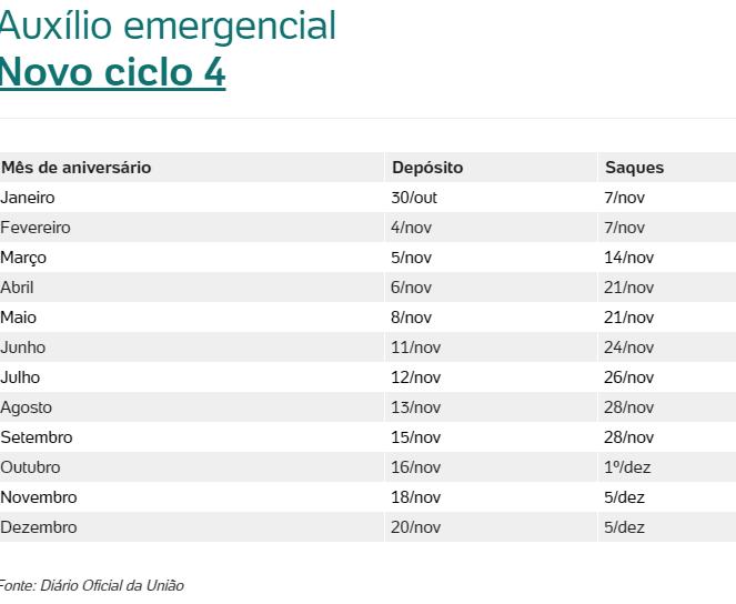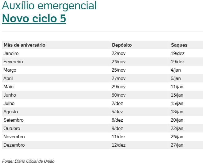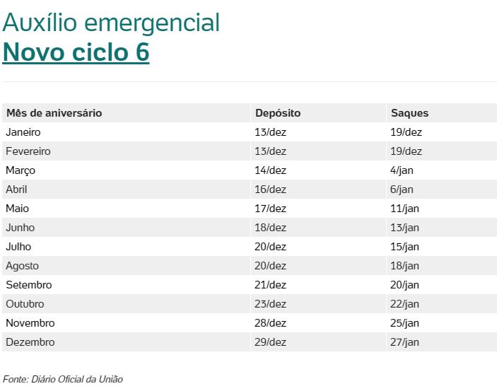 No total, serão seis ciclos de pagamento, com depósitos até 29 de dezembro e saques até 27 de janeiro.