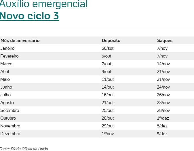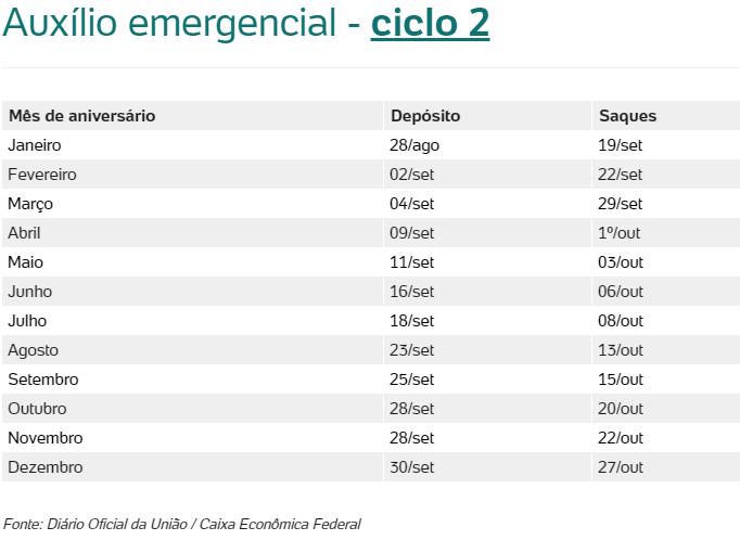 A Caixa chama de ciclo cada calendário em que os beneficiários recebem pelo menos uma parcela, independente de qual seja. Esses cronogramas seguem por ordem do mês de aniversário, começando com os nascidos em janeiro e terminando com os de dezembro.