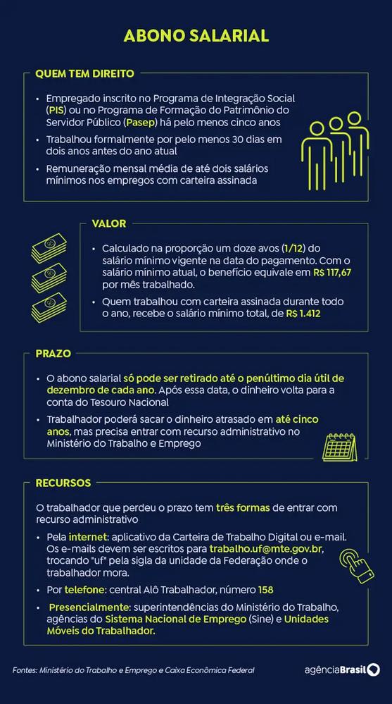 Quem tem direito - Tem direito ao benefício o trabalhador inscrito no PIS/Pasep há, pelo menos, cinco anos, e que tenha trabalhado formalmente por, no mínimo, 30 dias no ano-base considerado para a apuração, com remuneração mensal média de até dois salários mínimos. Também é necessário que os dados tenham sido informados corretamente pelo empregador na Relação Anual de Informações Sociais (Rais).