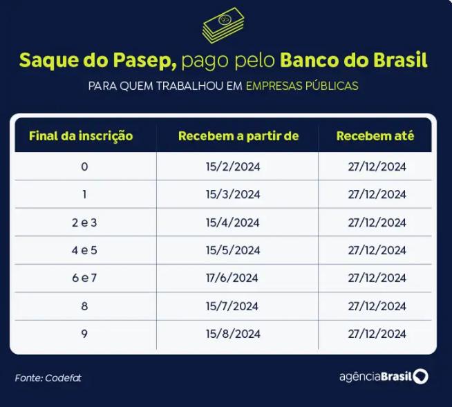 O PIS é pago pela Caixa Econômica Federal; e o Pasep, pelo Banco do Brasil. Como ocorre tradicionalmente, os pagamentos serão divididos em seis lotes, baseados no mês de nascimento, no caso do PIS, e no número final de inscrição, no caso do Pasep. O saque iniciará nas datas de liberação dos lotes e acabarão em 27 de dezembro de 2024. Após esse prazo, será necessário aguardar convocação especial do Ministério do Trabalho e Previdência.