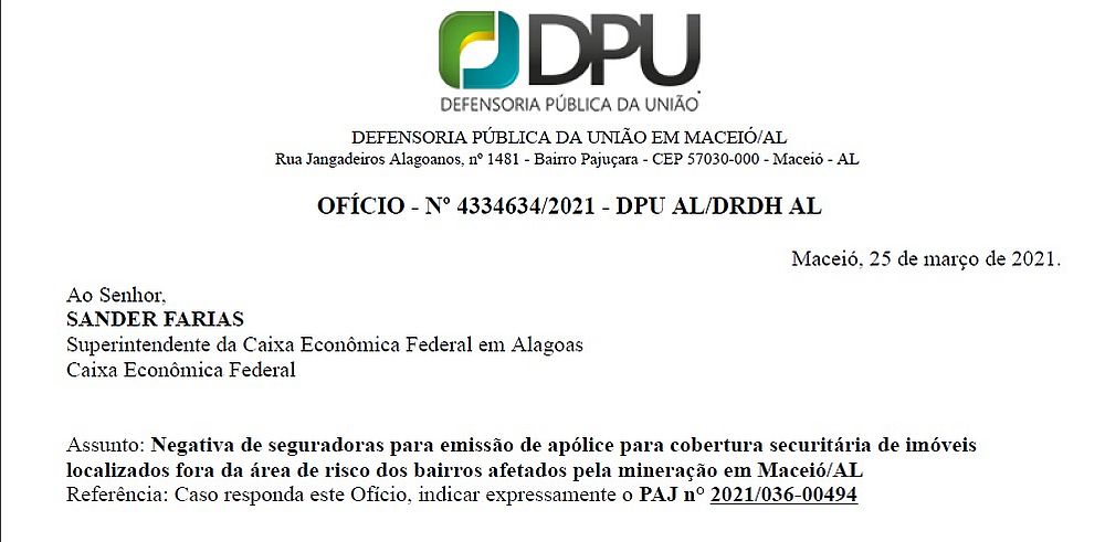No documento é dado prazo de cinco dias para Caixa responder aos questionamentos sobre a negativa das seguradoras na emissão das apólices de seguro. A área onde estariam havendo as recusas incluem até mesmo bairros que estariam de fora da área de risco por conta da mineração da Braskem.